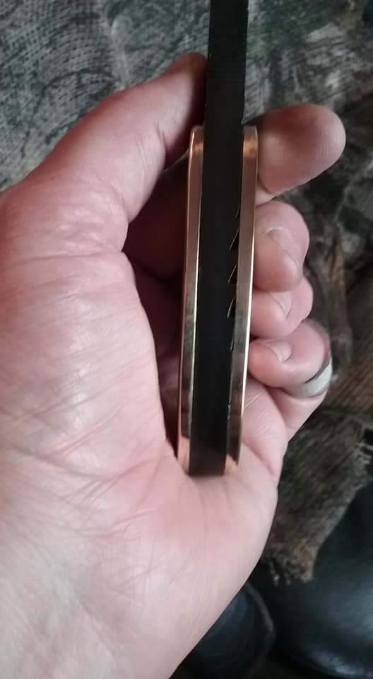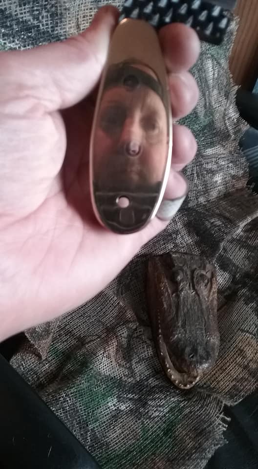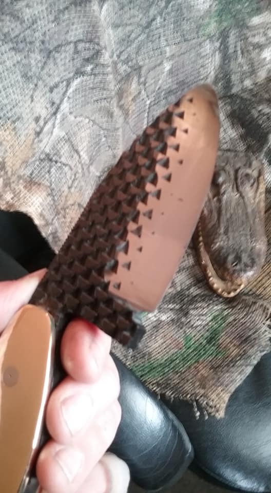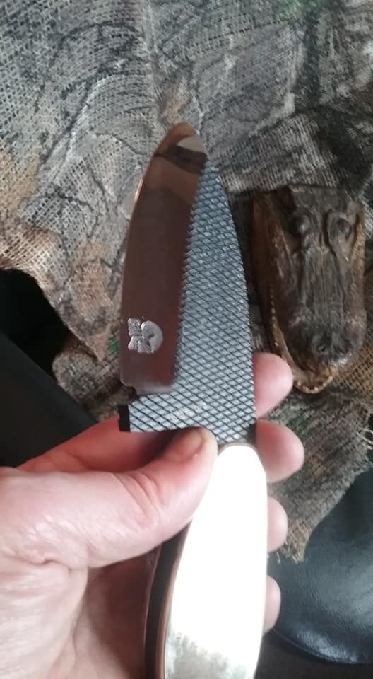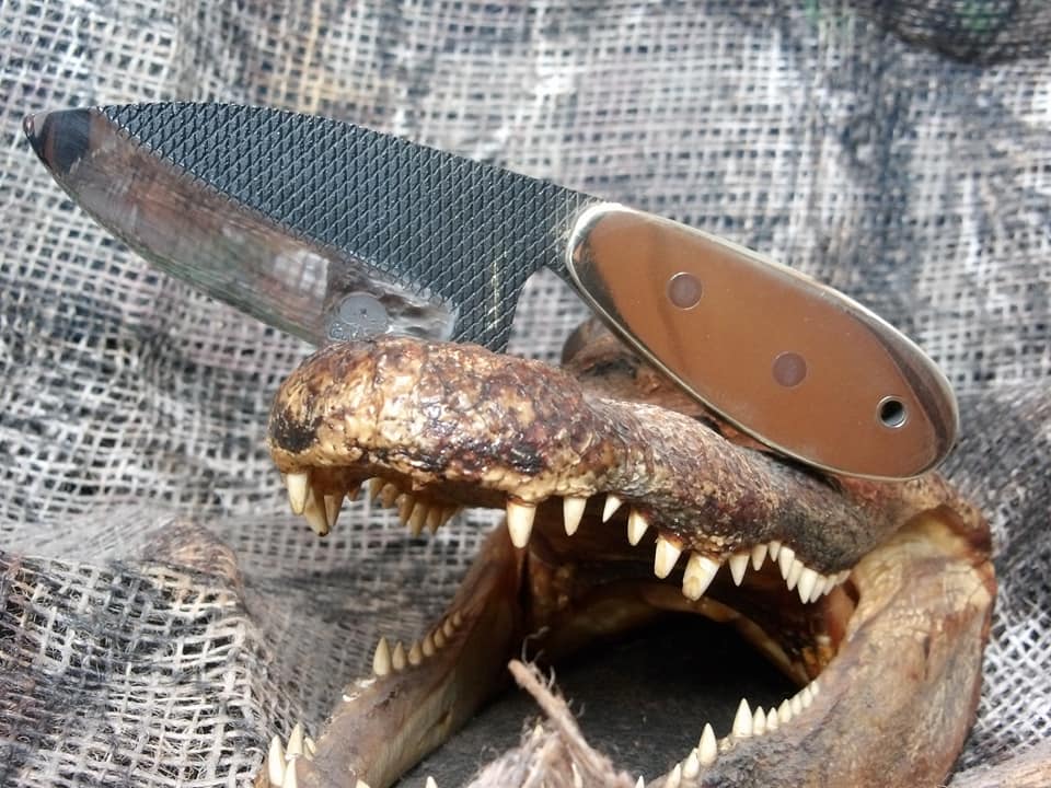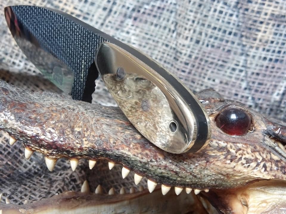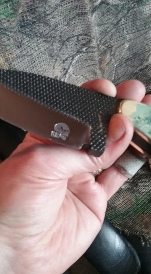 This knife is a ballet of opposites. The very wide thick blade is very short. It's extremely aggressive in the original tooth pattern and polished to over 6000g. It is small but heavy. It is flat black and polished brass and steel. Unfortunately, it's also sold. Gorgeous piece and one of our favorites.